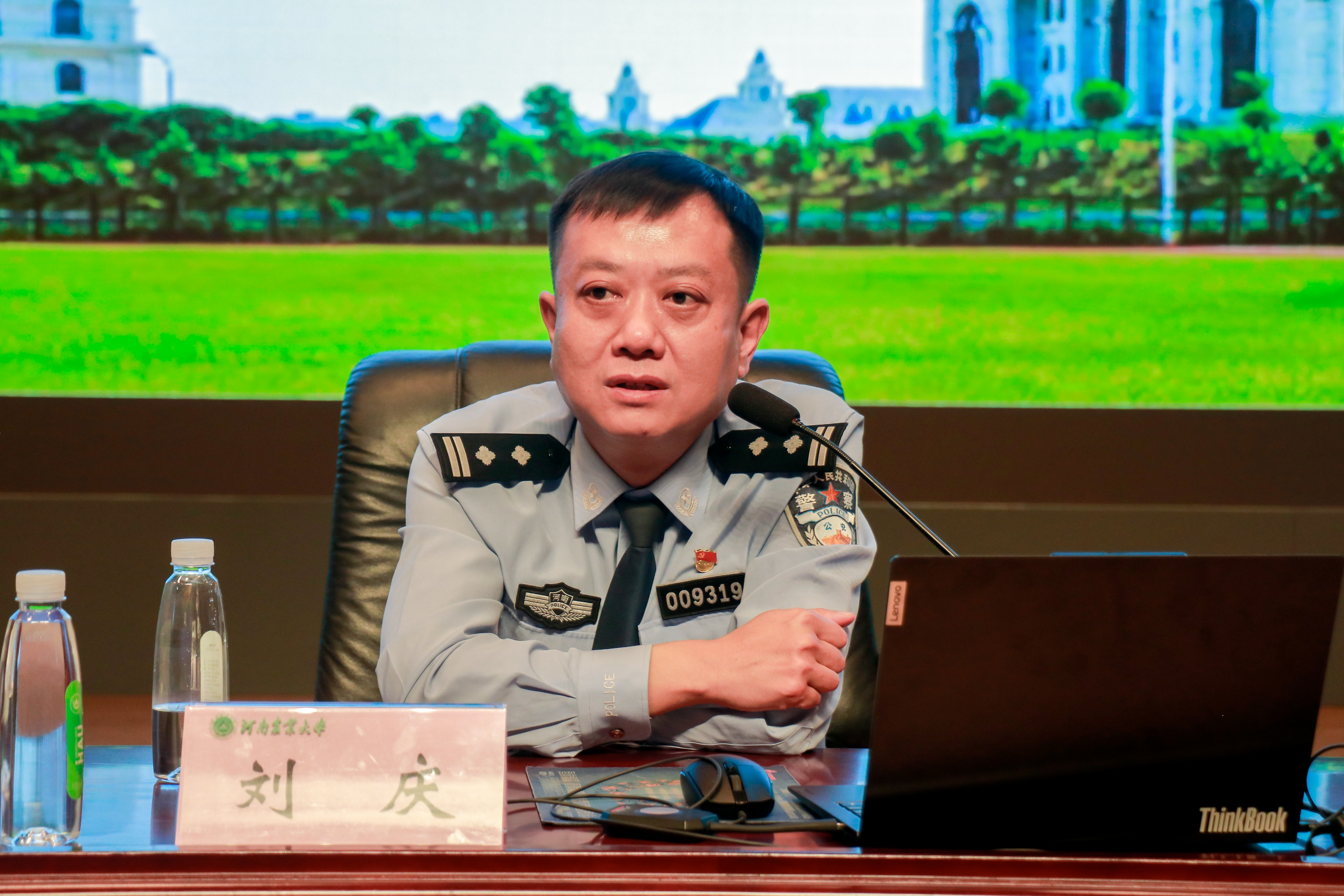 讲座伊始,刘庆进行发言。他从电信网络诈骗的危害性、常见手段、防范要点等方面展开深入讲解。详细剖析了刷单返利诈骗,此类诈骗往往以小额返利吸引大学生入局,随后诱导其投入大额资金后失联;还有网络贷款诈骗,骗子打着低息、无抵押的幌子,以缴纳手续费、保证金等为由骗取钱财。刘庆结合实际案例剖析诈骗分子的作案思路,提醒学生们提高警惕、不轻易透露个人信息。