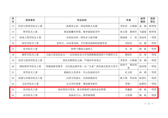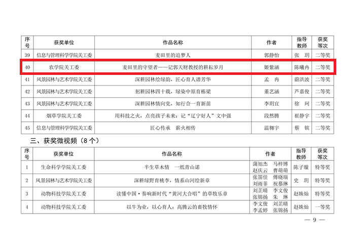 师生佳作频出、捷报连连。其中,由杨含笑撰写,陈曦冉老师指导的征文《以种为炬,照见大国粮仓的守护者——致敬西北玉米种子生产基地的开拓者陈伟程》表现突出,不仅荣获学校特等奖,还拿下河南省教育厅关工委特等奖,更斩获教育部关工委最佳征文奖,成功入围中国教育电视台优秀作品展播。此外,吴彤的《把种子播进大地的人》、李鑫淼的《麦田里的守望者:郭天财教授与他的金色梦想》等10篇征文分别获评学校一、二等奖,刘昱莹等人创作的微视频《玉种传薪 九旬笃行》荣获学校一等奖。草榴