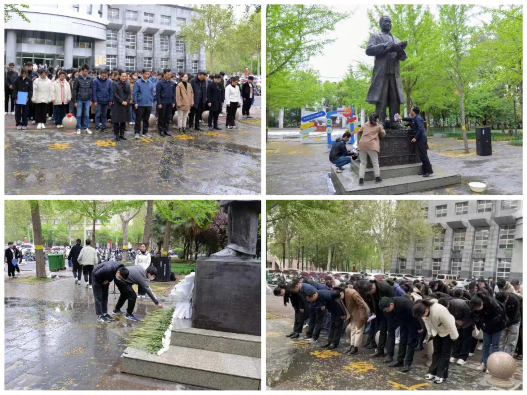 师生代表在文化路校区工程楼吴老铜像前举行“缅怀先贤 勇毅前行”主题党日活动。草榴