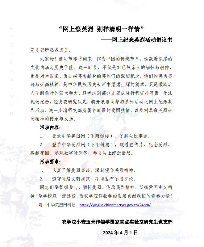 本网讯(通讯员 陈美羽 常洪庆)烈士忠魂千秋在,英雄浩气万古存。为缅怀革命先烈、弘扬英烈精神、传承爱国情怀,2024年4月2日-4日,草榴小麦玉米作物学国家重点实验室研究生党支部开展以“清明祭英烈 共筑中华魂”为主题的系列党日活动,包括“重温红色电影,点燃家国情怀”线上观影活动、“铸魂——2024清明祭英烈”活动。支部全体党员、入党积极分子参加了此次活动。