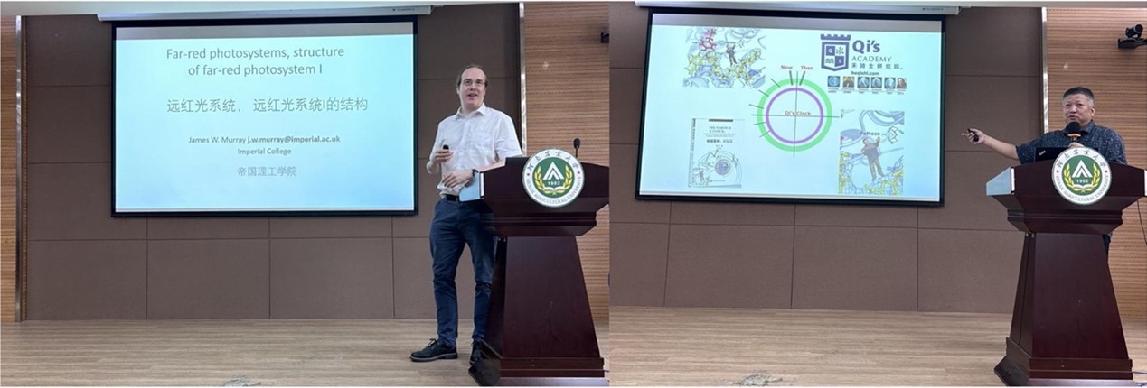 师生做了题为“Far-red photosystems, structure of far-red photosystem I”和“有助于科学研究的AI工具”的学术报告。报告中,Murray博士介绍了蓝藻含有多个psbA(D1)基因,并分析了不同D1突变体的活性中心结构,其中有一类特殊的D1,该类型的D1蛋白能够形成PSII复合物,并参与chl f的合成,报告最后,Murray博士展示并比较了不同类型far-red PSI的Cryo-EM结构。程奇教授则结合个人求学和工作经历给大家带了一场幽默风趣、丰富精彩的学术报告,全方面的从固氮酶基因的发现到其结构的解析由浅入深、娓娓道来,详细介绍了Lpor蛋白酶的单体、二聚体、高聚体的蛋白结构解析。不仅讲述了科学问题提出和解决的过程,更介绍了科学背后的科学故事。报告结束后,程奇教授与草榴师生进行了深入的互动交流,探讨了结构生物学领域的一些新研究手段,为开展相关领域研究的工作拓展了思路。