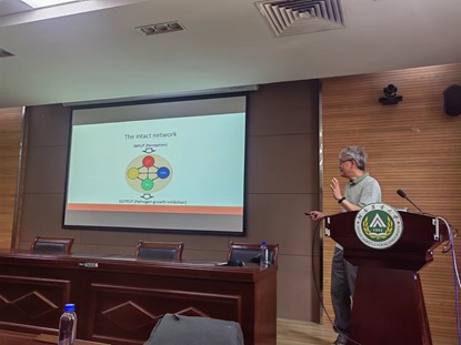 第六期CIMMYT-中国玉米科学创新国际论坛在龙子湖第一实验楼南321报告厅开讲。美国明尼苏达大学的Fumiaki Katagiri教授以“How can plants stay in this world while their pathogens can evolve much faster?”为题,详细介绍了他的研究团队如何利用模式生物拟南芥(Arabidopsis)和其细菌病原体铜绿假单胞菌(