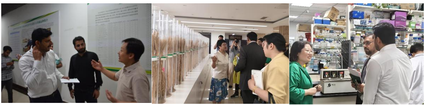 在草榴王桂凤教授、张坤普研究员及张建萍教授的陪同讲解下,代表团一行分别参观了解了草榴小麦玉米两熟高效生产全国重点实验室及作物基因组学与分子育种中心实验室。代表团还与草榴部分巴基斯坦籍留学人员进行了交流。