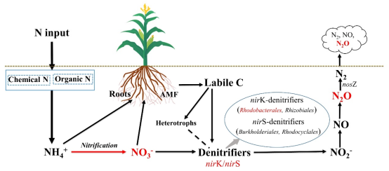 图氮肥输入、玉米根系和AMF影响土壤性质、反硝化菌和N2O排放概念图