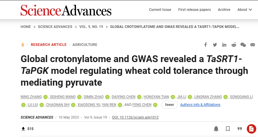 陈锋教授团队历经5年在小麦低温抗性机制研究方面取得突破性进展,该团队利用巴豆酰化组学、全基因组关联分析和转录组等多种分子生物学手段克隆出调控小麦低温的重要基因TaPGK。进一步通过转基因过表达、基因编辑等技术对该基因进行了系统的功能验证,并利用多种蛋白互作技术和巴豆酰化修饰技术对其调控机制进行解析,发现TaPGK能够与TaSRT1蛋白互作且被后者去巴豆酰化,从而揭示了TaSRT1-TaPGK分子模块通过促进丙酮酸积累来调节小麦低温抗性的作用机理。该研究成果以题为“Global crotonylatome and GWAS revealed a TaSRT1-TaPGK model regulating wheat cold tolerance through mediating pyruvate”的论文形式发表在国际著名Science子刊Science Advances上。我校草榴