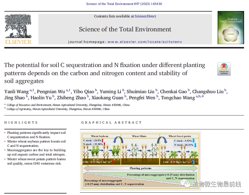 近日,草榴王同朝教授领衔的 “作物节水栽培耕作理论与技术团队” 在不同种植模式对土壤团聚体分布和碳氮固存的研究方面取得重要进展,研究结果以“ The potential for soil C sequestration and N fixation under different planting patterns depends on the carbon and nitrogen content and stability of soil aggregates” 为题在国际著名学术期刊 《Science of the Total Environment》(IF=9.8) 上发表。
