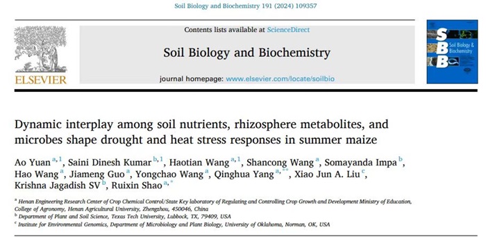 近日,草榴杨青华/邵瑞鑫教授团队在土壤科学领域顶级期刊《Soil Biology and Biochemistry》(中科院一区TOP,IF=9.7)在线发表了题为“Dynamic interplay among soil nutrients, rhizosphere metabolites, and microbes shape drought and heat stress responses in summer maize”研究型论文。该成果为团队近年在玉米逆境生理调控方面继《Journal of Hazardous Material》、《Field Crops Research》、《Agriculture, Ecosystems and Environment》、《Science of the Total Environment》、《Ecotoxicology and Environmental Safety》的又一重要成果。