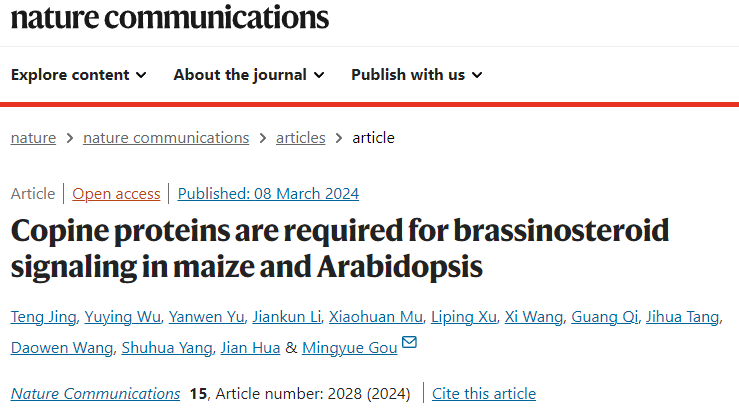 苟明月教授课题组在国际著名学术期刊Nature Communications在线发表了题为“Copine proteins are required for brassinosteroid signaling in maize and Arabidopsis”的研究论文。该研究以单子叶植物玉米和双子叶植物拟南芥为研究材料,发现Copine蛋白(BONZAI)是BR受体蛋白复合物中的新成员,在BR信号通路中发挥重要作用。
