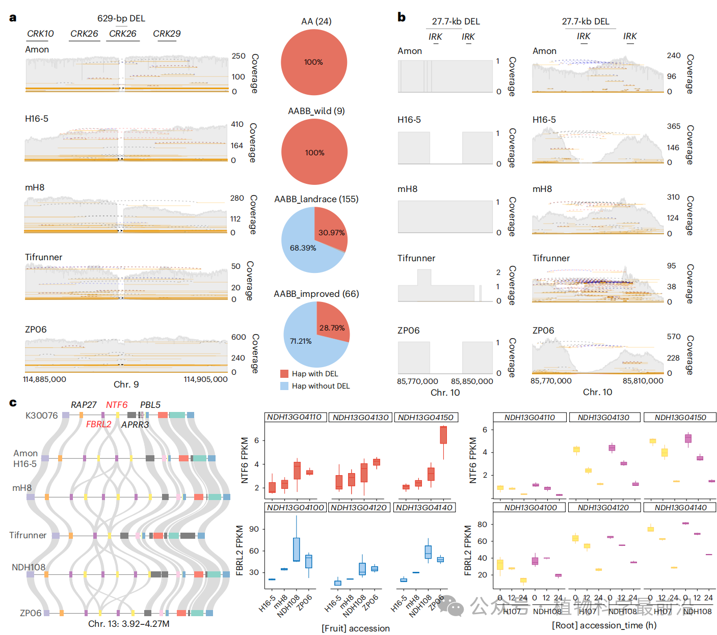 为探究驯化过程中基因组结构变异对基因功能的影响,研究团队进行了全基因组选择性清除分析。结果显示,不同染色体区域在驯化过程中受到不同程度的选择压力,B亚基因组受选择区域是A亚基因组的两倍。全基因组鉴定出1,335个与驯化相关的SV,其中329个发生在基因编码区域。值得注意的是,19个基因与果实大小、抗病等性状相关。其中,CRK26基因存在629bp缺失,NTF6基因与FBRL2基因组成的串联单元在不同花生品种中存在拷贝数变异。此外,研究还鉴定出117个与种子重量相关的结构变异,并通过SV-GWAS分析在Chr03染色体上鉴定到一个与花生籽粒重量显著关联的结构变异(图3)。