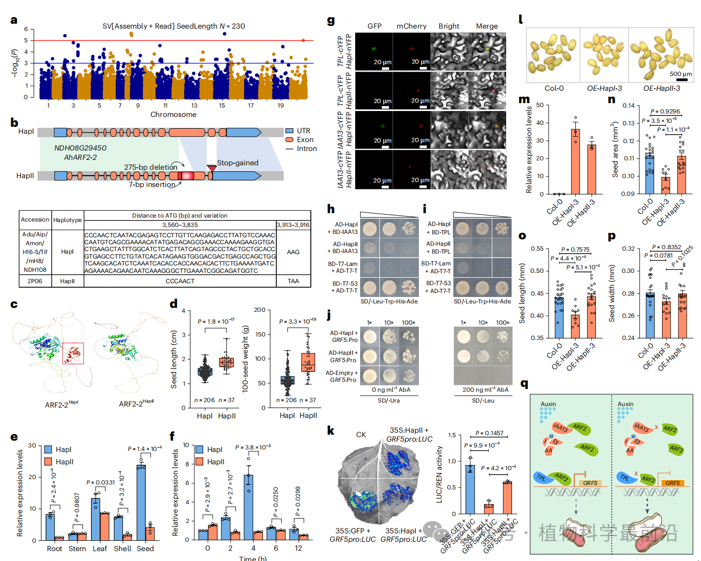 尤其重要的是SV-GWAS鉴定到Chr08染色体52 Mb区域存在与籽粒大小显著关联的SV,发现AhARF2-2基因第12个外显子存在275 bp缺失和7 bp插入,导致AUX/IAA结构域丢失。突变型AhARF2-2HapII丧失与AhIAA13/TPL的互作能力,降低了对AhGRF5的抑制作用,进而促进了籽粒膨大。转基因拟南芥表明,HapII株系种子显著增大。分子标记开发及表达分析证实该变异在栽培种中的选择优势,进而提出AhARF2-2调控花生籽粒大小的分子模型,为花生高产育种提供关键靶标(图4)。