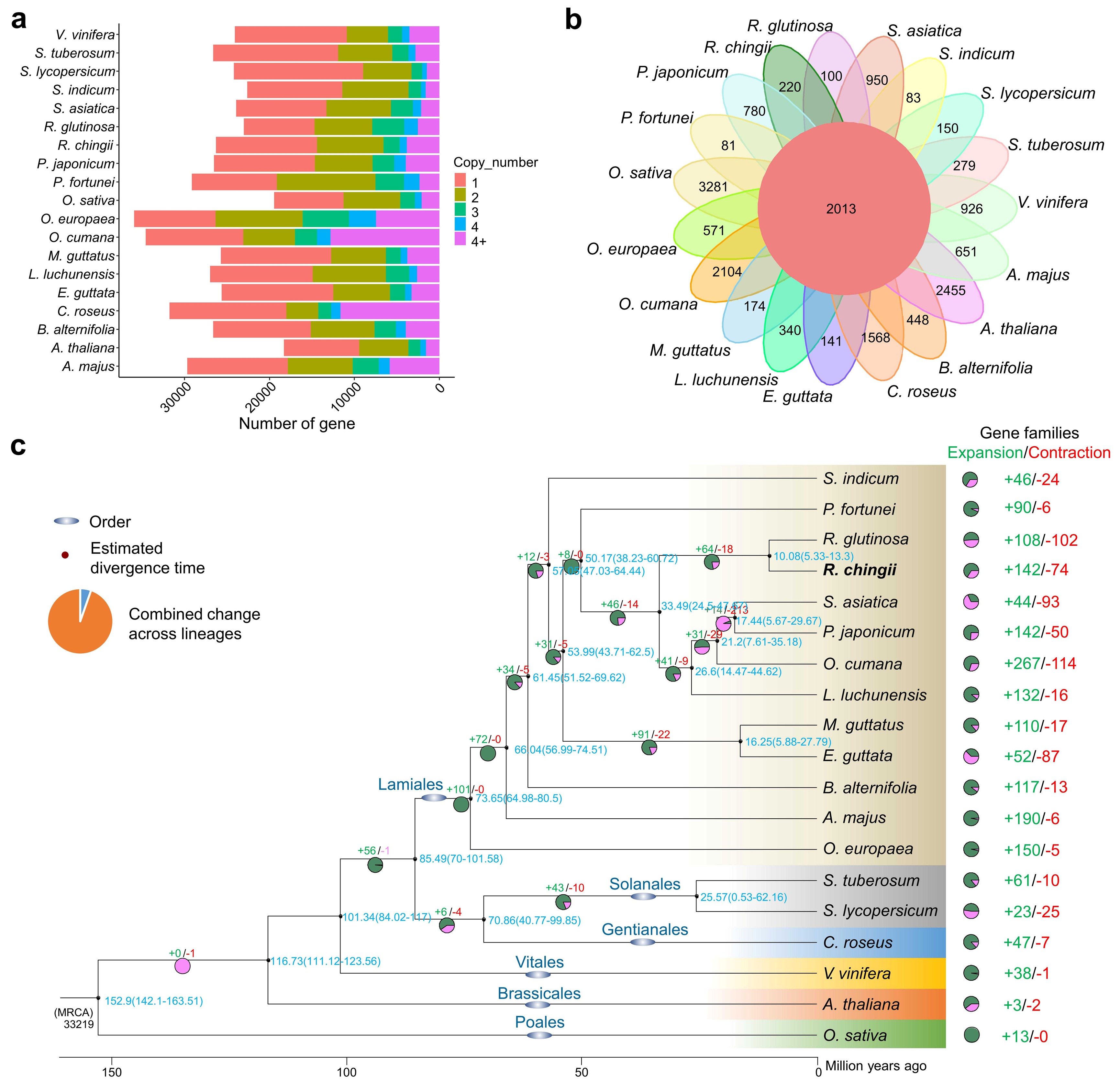 de novo预测、同源比对和RNA-seq分析(二代和三代全长转录组)共预测到29,322个基因,其中29,007个基因(98.93%)被注释到NR、SwissProt、KEGG、InterPro、Pfam和GO 等6大数据库中。利用272个单拷贝基因家族构建系统发育树,发现地黄和天目地黄呈单系分支,与列当科植物独角金、松蒿、欧亚列当、绿春钟萼草的亲缘关系最近,而与玄参科植物互叶醉鱼草的亲缘关系较远,证实地黄属植物属于列当科。然而,由于地黄属植物与其它列当科植物在进化、形态和生活习性等方面的明显区别,建议地黄属植物和岩白菜属植物归属地黄科Rehmanniaceae。