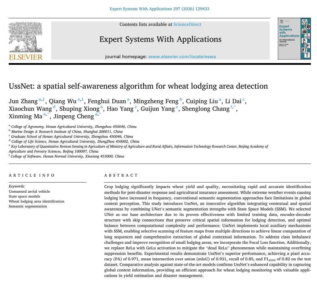马新明教授团队在国际期刊Expert Systems with Applications (IF=7.5)在线发表了题为“UssNet: a spatial self-awareness algorithm for wheat lodging area detection”的研究性论文。研究聚焦小麦倒伏区域识别精度低等问题,提出了一种结合上下文和空间感知的UssNet算法。UssNet充分发挥了UNet语义分割和State Space Models(SSM)全局上下文感知优势,更加关注图像全局信息,提高了小麦倒伏区域的识别精度,为作物倒伏监测提供了新视角。