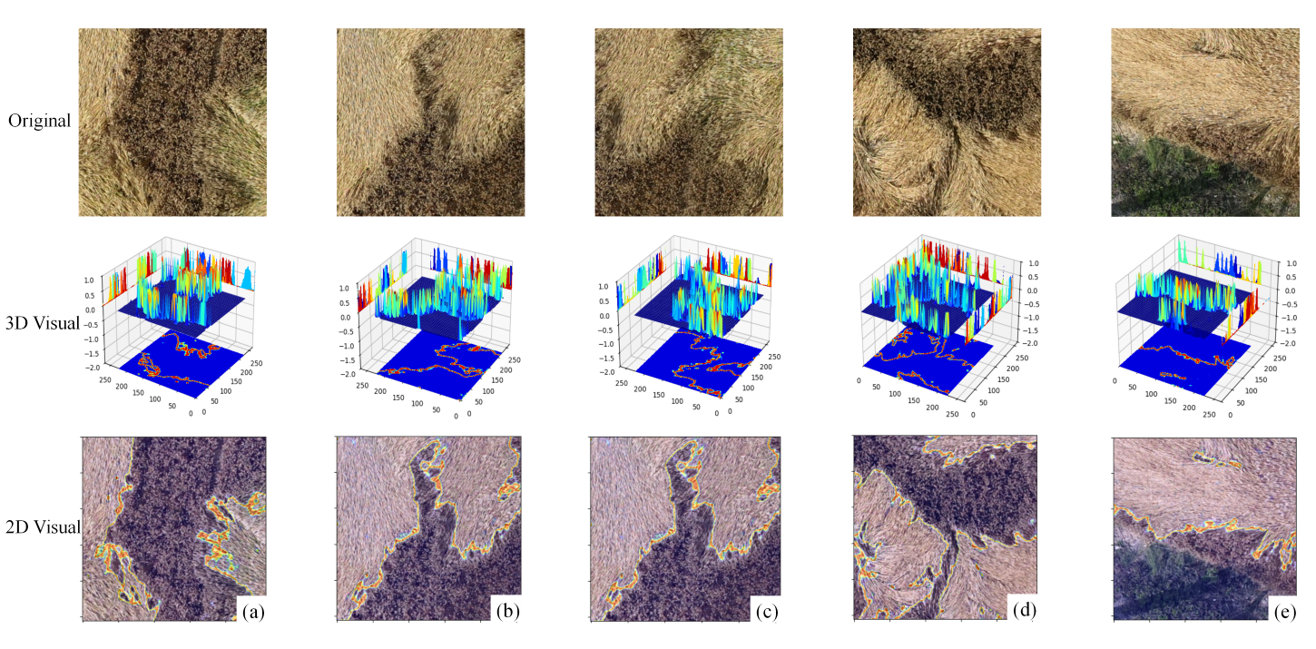 研究为了验证UssNet算法模型的泛化能力,选取许昌建安区、内蒙古五原县、新乡原阳县等4个地块作为独立验证数据集。原阳3数据集(2.69公顷)具有大规模适用性,内蒙古五原县和许昌建安区提供跨区域、跨季节的不同小麦品种(春小麦和冬小麦)验证。同时,原阳3和建安区数据包含不同的地面样本距离(GSD)验证,削弱了地形变化和倒伏模式等混杂因素的影响,实现了算法在不同高度的鲁棒性。研究为未来小麦倒伏的遥感监测提供了可靠的技术路径。
