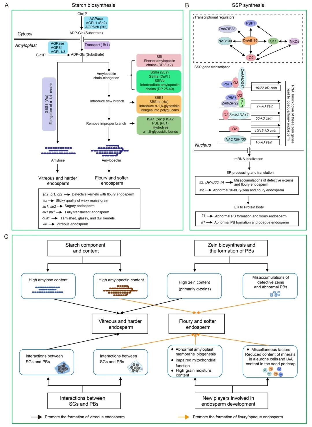 文章重点介绍了玉米硬/粉质胚乳形成的分子遗传调控进展(图2)。特别是,玉米胚乳淀粉和醇溶蛋白合成相关基因的克隆及功能解析,极大推进了玉米籽粒质地形成的分子本质认知。玉米籽粒发育核心转录因子,如O2、PBF1、ZmbZIP22、MADS47、NAC128/130、OHP1/2、O11和ABI19等相继报道,为玉米储藏物质转录调控网络构建提供了重要的线索。此外,一些新的参与胚乳发育的调节因子,如造粉体膜生物合成相关(O5、Dek5和Ven1)、线粒体功能相关(zNDUFAF1、ZmTIM17-1、ZmIVD1、MDH4和O18)和籽粒脱水相关(qKDR1)等,直接或间接影响玉米籽粒质地的形成。最后,文章评论了玉米籽粒质地研究尚未解决的问题、可能突破方向和如何利用改良籽粒性状。
