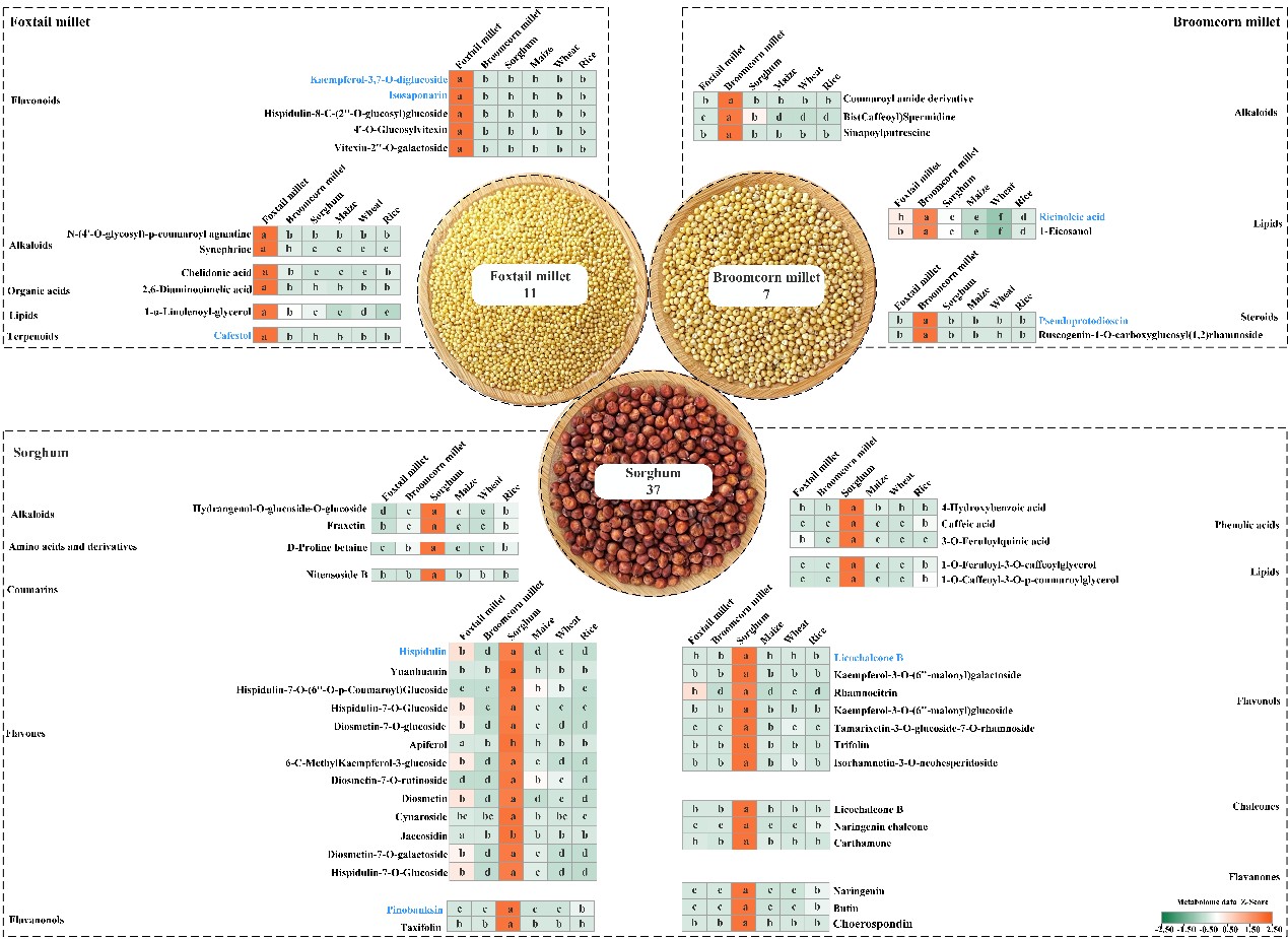 该研究使用UPLC-MS/MS检测平台杂粮和粗粮进行了代谢组学分析。共鉴定出783种代谢物,包括341种初生代谢产物、424种次生代谢产物和18种未分类化合物。主粮作物在初生代谢产物含量上表现出明显优势;而杂粮则展现出更强大的次生代谢产物多样性,谷子的酚酸类物质含量显著较高;糜子富含生物碱和独特的甾体化合物;高粱则拥有最全面的次生代谢产物谱系,尤其在单宁、香豆素和类黄酮的含量上优势突出。