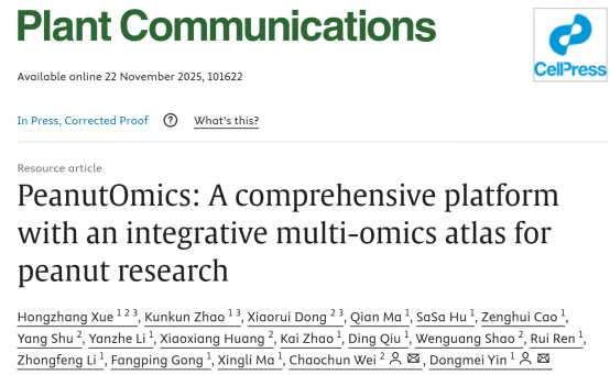 殷冬梅教授联合上海交通大学韦朝春教授研究团队,在Plant Communications期刊发表题为“PeanutOmics: A comprehensive platform with integrative multi-omics atlas for peanut research”的论文。该研究构建了花生全生育期22个组织转录组、蛋白质组与代谢组的全景图谱,并推出首个花生多组学数据平台PeanutOmics。该研究为解析花生生长发育机制、挖掘关键功能基因提供了全新工具,将显著加速花生分子育种进程,为保障全球油料作物安全提供重要支撑。