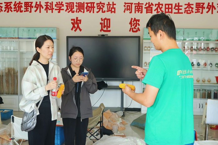 教师李荣发博士向到访的师生详细介绍了学生们正在进行的测产、考种工作,表示基地的师生参与这些玉米从播种到收获的全程,并带领师生考察了高产品种的株型结构、果穗性状以及与一般品种的差异。寻访师生手拿测产样品仔细观察,认真比对,受益匪浅。