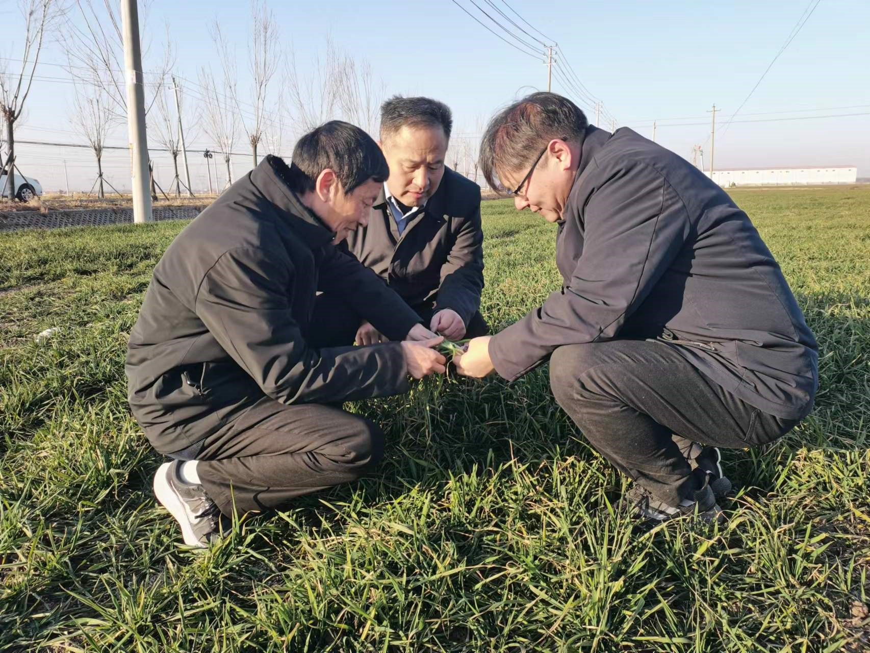 在淮阳区、商水县的麦田,殷贵鸿研究员和团队成员顶着寒风,深入田间地头,实地查看小麦生长情况,并与县农业农村局的技术员、当地农民和种粮大户面对面交流。针对当前小麦生长过程中存在的部分麦田旺长、茎基腐病和黄花叶病病株率较多和冬季干旱等主要问题,强调小麦冬季管理要因时因地、精细化、科学化管理,才能确保小麦健壮生长。详细讲解了晴暖中午科学镇压1-2次、化学控旺等多种措施控制旺长;及早喷施40%唑醚戊唑醇悬浮剂40毫升/亩防治小麦茎基腐病,每亩喷施20%吗啉胍•乙铜100克+云苔素内酯10毫升+磷酸二氢钾100克加水30公斤均匀喷雾防治小麦黄花叶病;对于口墒缺乏的部分麦田要选择近期天气晴暖的有利时机,在中午11点-15点时段微喷解决旱情。