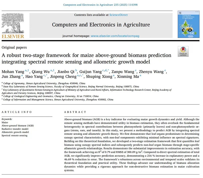本网讯(通讯员 刘一诺)在学术科研的征程中,草榴再传捷报!草榴2021级智慧农业专业本科生杨默含,凭借扎实的专业知识与不懈的探索精神,以第一作者身份在中科院一区TOP期刊《Computers and Electronics in Agriculture》(IF=7.7)上发表了题为《A Robust Two-Stage Framework for Maize Above-Ground Biomass Prediction Integrating Spectral Remote Sensing and Allometric Growth Model》
