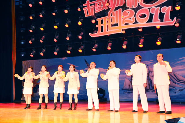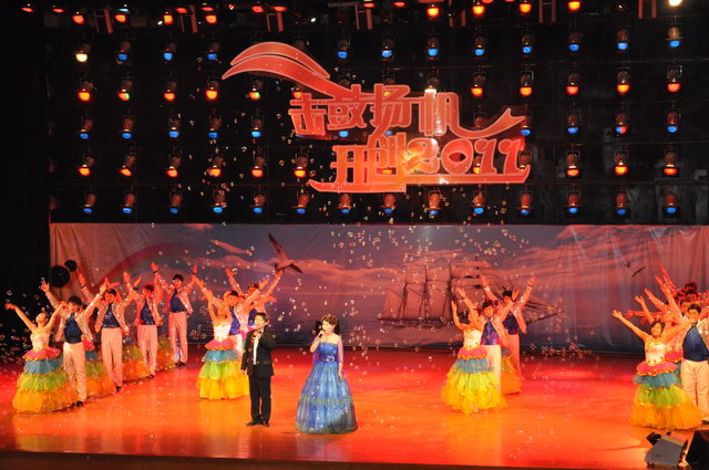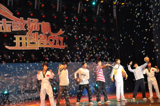 “击鼓扬帆开创2011”元旦师生联欢晚会在这里隆重开幕。校党委书记程传兴、副书记杨德东、王文亮,副校长张全国,校工会主席褚金海,党委宣传部部长王宾齐、研究生工作部部长杨秋生,学生工作部部长夏越新,武装保卫部部长雷振华,校团委书记郭战伟、副书记马菲及各兄弟学院的老师与草榴
