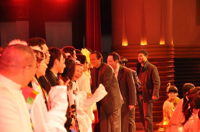 学生饱满的激情抒发的淋漓尽致,《山楂树》则又把学生细腻婉约的一面演绎的惟妙惟肖,相声《雅室评比》用它幽默而又风趣的语言博得观众的阵阵欢呼,研究生表演的小品《将心比心》以反串搞怪的形式吸引观众不时捧腹大笑。教工的民族舞蹈及快板书表演把晚会推向了高潮。最后,晚会在一首满怀豪情的歌伴舞《祖国万岁》中缓缓落下帷幕。校院领导纷纷走上前台与演员合影留念。