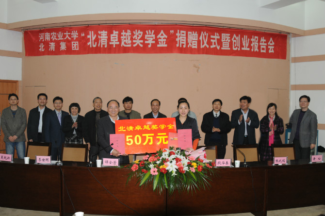 谭金芳代表学校致辞,对耿华春校友及北清集团的事业发展表示祝贺,对耿华春心系母校、关心母校学弟学妹们的学业与成长捐资助学的义举表示感谢。他表示,“北清卓越奖学金”的设立必将激励家境贫寒、品学兼优的学生努力学习、奋发成才;必将带动更多的农大校友关心母校发展,起到示范效应。