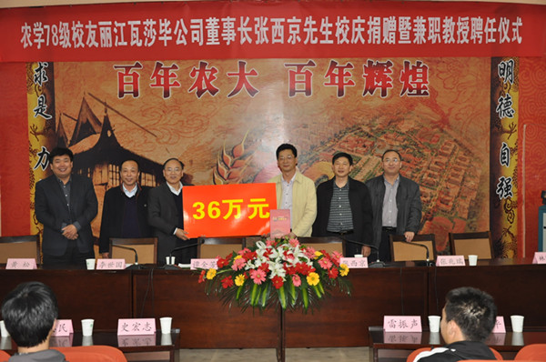 2012年4月12日下午,农学78级校友丽江瓦莎毕公司董事长张西京先生校庆捐赠暨兼职教授聘任仪式在三百人报告厅隆重举行。副校长、校庆筹委会副主任谭金芳出席,校庆办公室常务副主任李世国、计划财务处处长张兆瑞、草榴