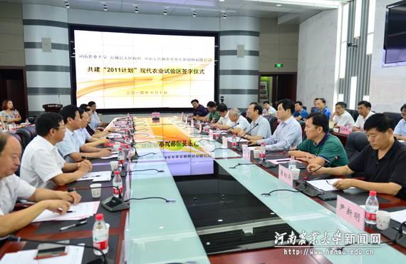 与方城县人民政府、河南五谷神农农业发展股份有限公司共建“2011计划”现代农业试验区签字仪式在中原农村信息港举行。南阳市委常委、副市长张生起,校领导程传兴、张改平、谭金芳,方城县县委书记褚清黎,河南赊店集团董事长单森林出席签字仪式。方城县有关负责人、河南五谷神农股份有限公司负责人、学校粮食作物协同创新中心、草榴