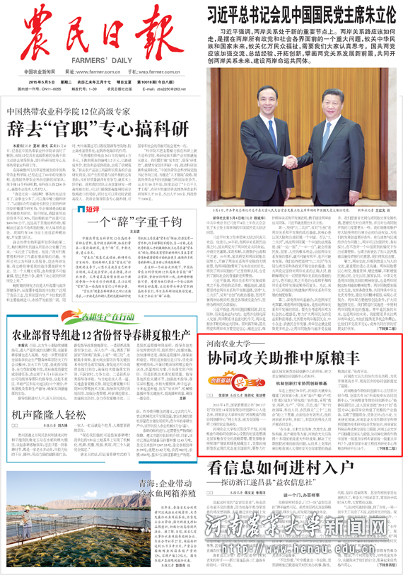 编者按:党的十八大以来,中央对实施创新驱动发展战略作出了一系列战略部署。根据中宣部要求,农民日报结合自身特点开展了“创新驱动兴‘三农’”专题宣传报道活动。该项活动在全国13个省(直辖市)选取了13个农业科研院所或农业大学,重点宣传他们在深化体制机制改革、实施创新驱动发展战略方面的突出亮点,宣传他们的典型经验、成功做法、有益探索及生动实践。我校由于在协同创新、支撑国家粮食安全方面的突出贡献,名列其中。5月5日,农民日报在头版显著位置以“草榴