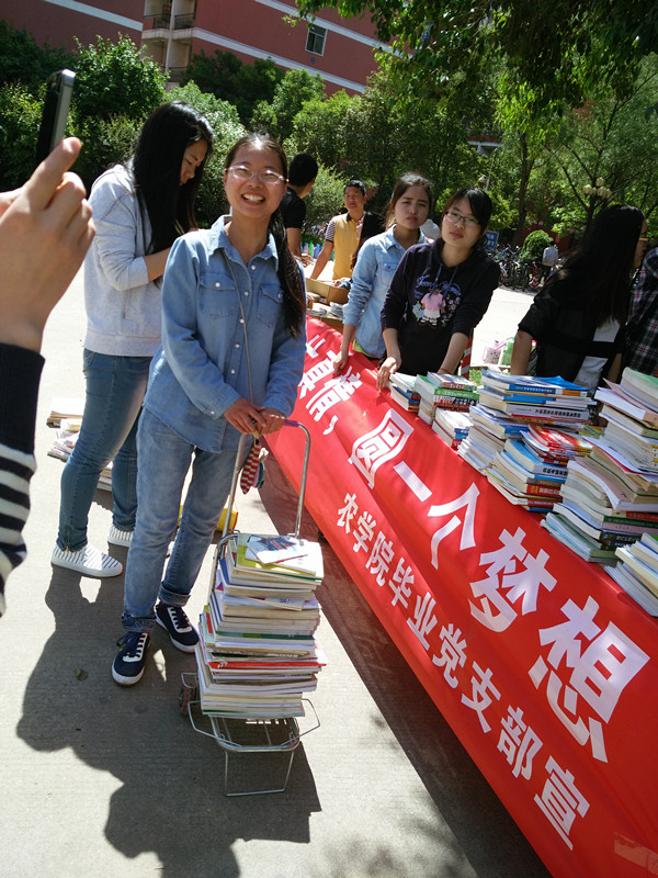 活动从上午10点到下午2点,广大毕业生党员积极参与,不仅有毕业生捐书,还有现场赠与低年级书籍活动。大四学生将自己的考研资料,专业书籍,英语四六级,公务员复习资料等书籍,踊跃捐出,赠给了现场的低年级学生,形成了一次知识的转接和友谊的传递。捐赠现场,大四毕业生一边捐书,一边和低年级学生交流考研心得以及学习经验,气氛十分热烈。
