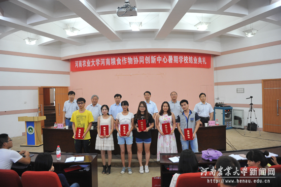 院长、协同创新中心副主任林同保宣读了《河南粮食作物协同创新中心关于表彰2015年度暑期学校优秀学员的决定》。在欢快的音乐声中,与会领导为优秀学员颁奖。