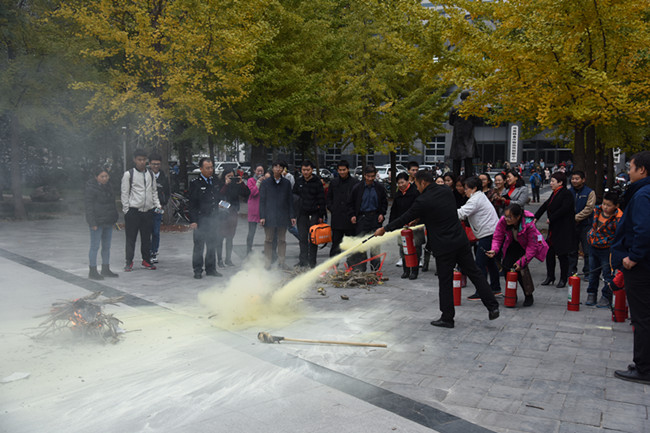报告介绍后,师生们来到工程楼南面,开展灭火器使用现场教学,并进行了现场灭火演练,提高消防灭火的实际操作能力。(图/刘拓文/张辉)