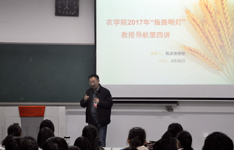 的了解、对吴绍骙教授的了解等三个问题入手,引发在座学生思考自己是否了解所学专业以及是否“热爱”它,并强调了对“热爱”所学专业的重要性。陈教授从学校的百年历史讲起,并结合自身的经历,引导学生学农爱农,激励和鼓舞同学们要有一种“现在,我为农大自豪;以后,农大以我为骄傲”思想,在专业上实现自身的价值。