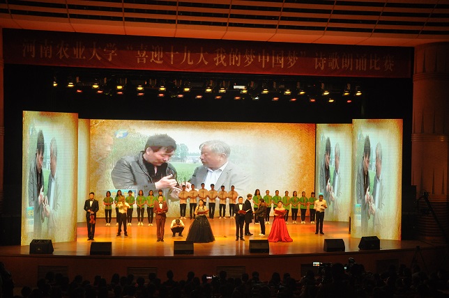 参赛团队高亢激昂地朗诵着诗歌,饱满真挚的感情顿时弥漫全场。在朗诵的同时,学生们以表演的形式还原了郭天财教授工作、生活的画面。朗诵结束时,舞台上飘扬着我校校旗和草榴