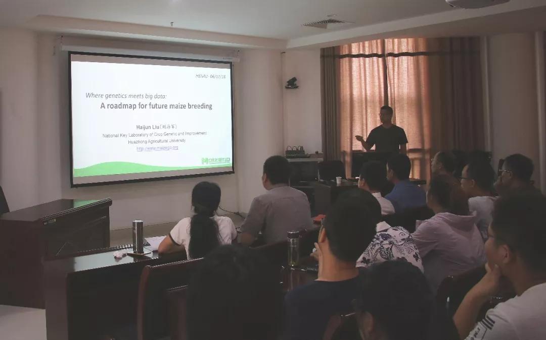 报告会上,刘海军博士为大家讲解了玉米适应性演化,不同品种玉米复杂转录调控网络的构建,以及大数据库的建立和不同品种的比对以求增加效益的方法,利用大数据库对两个品种的玉米进行配比,模拟杂交结果,对其重要遗传性状进行结构剖析,得到数据以指导育种,同时介绍了自己所在的实验室的科研成果。