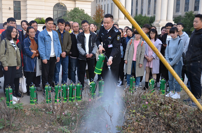 刘顺齐教员用现实生活中多起触目惊心的火灾事故案例,讲述了火灾的危害及事故发生的原因,如何预防火灾的发生,如何使用灭火器扑灭早期火灾。同时,还讲授了实验室、学生宿舍以及高层建筑火场如何逃生、自救等消防安全知识。最后,在教学楼西侧广场,教职工生们进行了模拟火灾逃生现场演练,以及正确使用灭火器的演习。