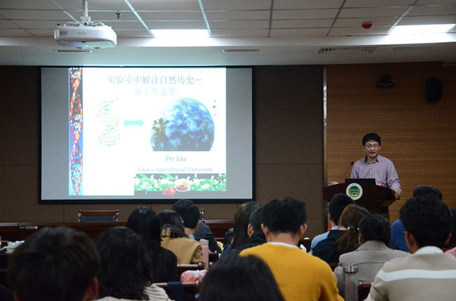 刘培教授以“分子生态学:实验室中的自然历史”为题,介绍了分子生态学这一新兴学科的概念、发展历史和研究进展,并以植物激素茉莉酸转运蛋白介导植物生态互作为例介绍了其团队在分子生态学中的研究进展。