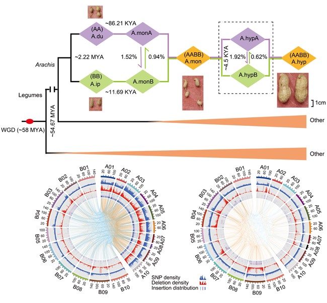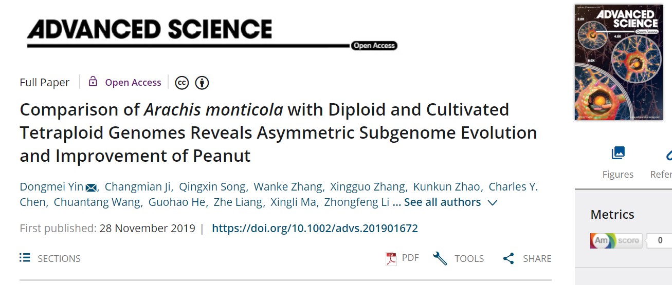 近日,殷冬梅教授团队在Wiley知名期刊《Advanced Science》上发表题为“Comparison of Arachis monticola with diploid and cultivated tetraploid genomes reveals asymmetric subgenome evolution and improvement of peanut”的最新研究进展,首次明确了异源四倍体野生种Arachis monticola在花生从野生二倍体到栽培四倍体的重要驯化地位;证实了异源四倍体花生中A和B亚基因组的单系起源以及在驯化过程中的亚基因组功能分化;为多倍体基因组的进化、作物的驯化以及提高花生产量和抗性等性状具有重要价值。该杂志影响因子达到15.804(1区Top期刊),其中殷冬梅教授为第一作者和第一通讯,草榴