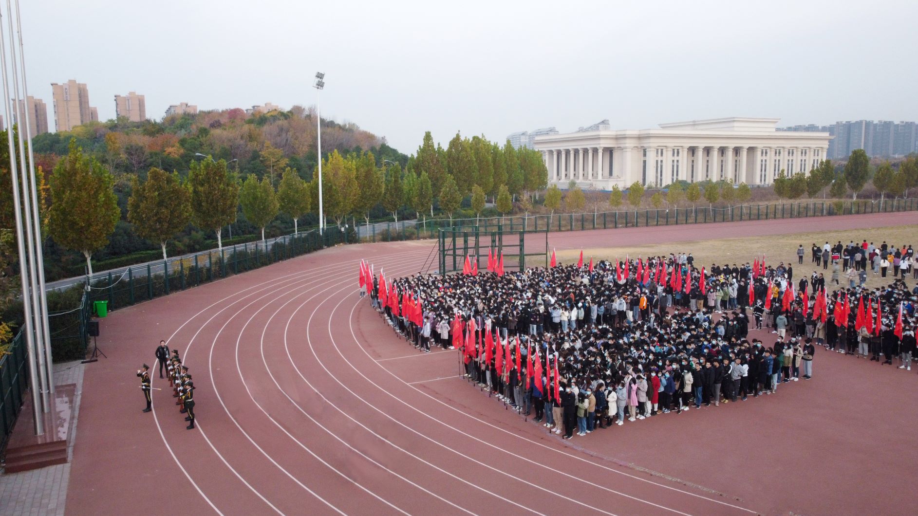 清晨的田径场上,初冬的寒意中涌动着热潮。伴着嘹亮的口号,在全院师生的注视下,国旗护卫队队员昂首挺胸,护卫着国旗,精神饱满地向升旗台走来。在雄壮的国歌声中,鲜艳的五星红旗迎着朝阳冉冉升起,全院师生齐唱国歌,向国旗行注目礼,表达对祖国无限的热爱和崇高的敬意。