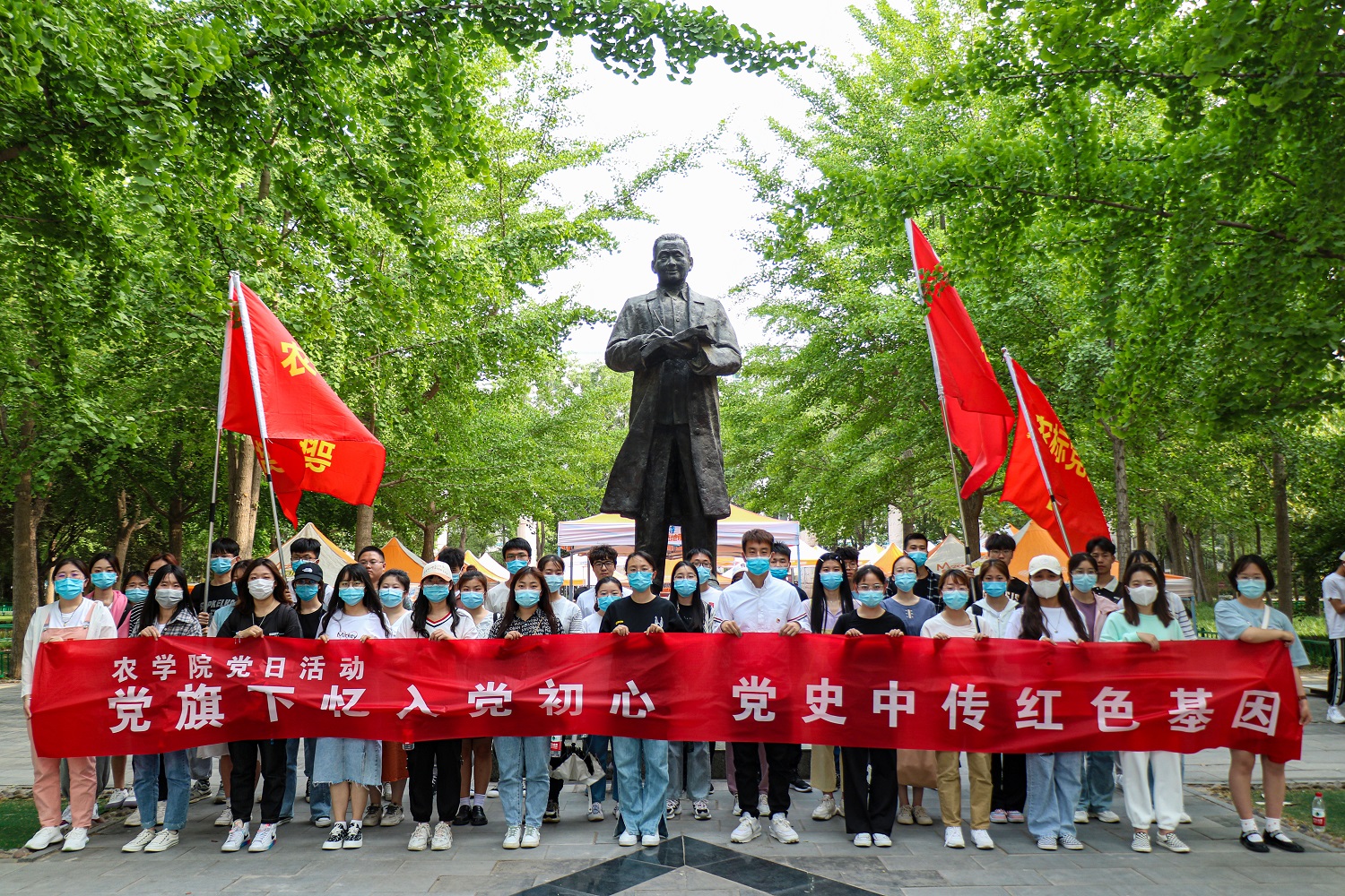 在文化路校区的校园里,矗立着两座作物育种学家吴绍骙老先生的铜像,讲述着百年农大以吴绍骙先生为代表的老一代农学人的故事,积淀着农大的历史与文化。同学们驻足学习先辈事迹。随后大家伫立在吴老铜像前,面对鲜红的党旗重温入党誓词,庄严的铜像、鲜红的党旗、铿锵的誓词,见证着农大学子的责任与担当。最后,全体人员共同唱响《绿色颂》,唱响千千万万农大学子共同的心声。