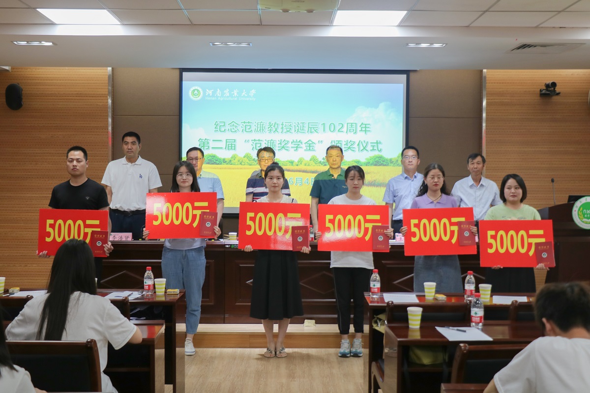 第二届“范濂奖学金”获得者的决定》,与会领导和范濂家属为22位获奖学生颁发奖学金并表示祝贺。随后,获奖本科生学生代表2017级中药学二班栗园林和研究生学生代表2019级作物学专业左鑫先后进行发言。她们表达了对领导老师的感谢和对范濂先生一生扎根农业、心系农民,常年奋战在科研一线的崇高敬意。同时,他们也讲述了自己的学习经历和曾经取得的成绩,指出“纸上得来终觉浅,绝知此事要躬行”,要努力把握现在,不畏艰辛与曲折去实现自己的追求。最后,他们立志要认真学习范濂先生无私奉献、追求真理和开拓创新的崇高精神,学习先生求真务实、奋斗不息的优秀品质,勇担重任,传承“农学精神”,真正做到学农爱农和弘农惠农。