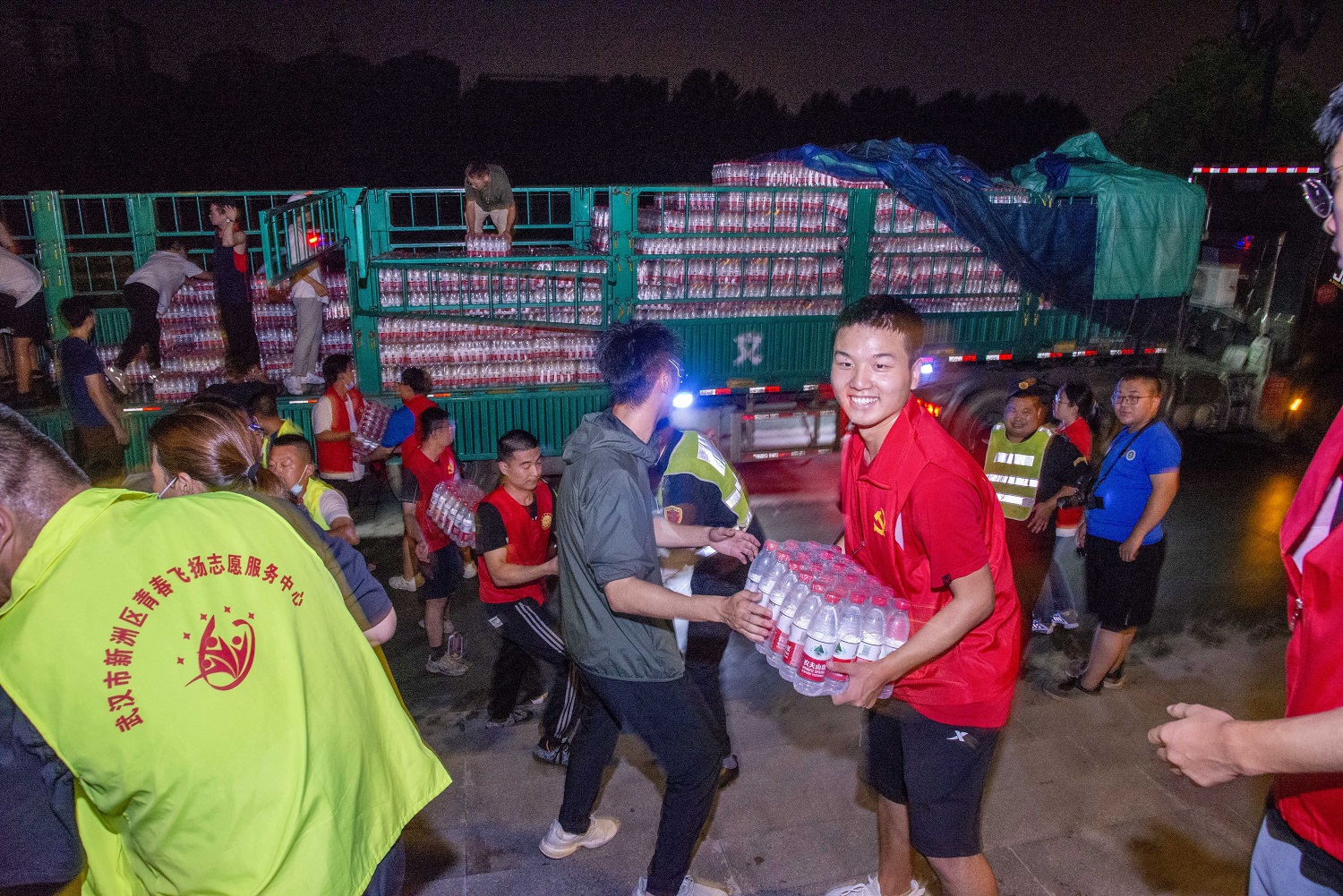 7月24日凌晨1点半,两位辅导员带领这28名志愿者提前在物资车经过路段搬开石堆、植物景观等障碍物。凌晨4点,与其他兄弟学院一起迎接共青团武汉市新洲区委员会支援我校的1500件饮用水的物资车到来。在卸车过程中,辅导员老师和学生志愿者们搭起人桥,高效传递着物资,更像是传递着一份战胜困难的信念,大家集合力量、躬身力行,每个人都热汗淋漓、筋疲力尽,但学生志愿者们互相鼓劲加油,丝毫不敢松懈,一直坚持到最后。