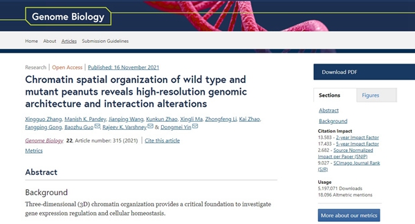 殷冬梅教授团队在国际基因组学顶级期刊《Genome Biology》(5Y IF 17.433)发表了题为“Chromatin spatial organization of wild type and mutant peanuts reveals high-resolution genomic architecture and interaction alterations”的研究论文。该研究首次绘制了花生三维基因组(Three-dimensional (3D) chromatin organization)图谱,综合Hi-C、ATAC-seq、多组织表达谱联合分析和3C等实验揭示了染色质空间结构特征及其对花生株型的影响。该研究拓展了人们对花生3D基因组与基因调控之间关系的理解,促进了花生功能基因组学研究,为开展花生遗传改良和种质创制提供了重要的理论创新与技术支撑。