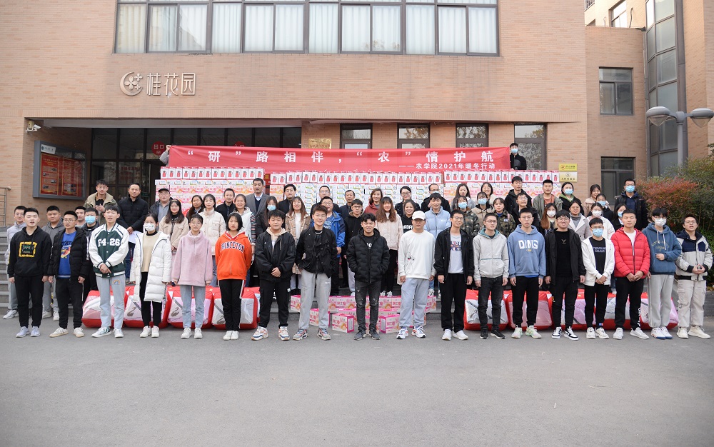 于龙子湖校区桂花宿舍楼下举办“‘研’路相伴,‘农’情护航”2021冬季送温暖活动。学院领导班子、团委老师、2018级班主任老师以及学生代表参加了此次活动。