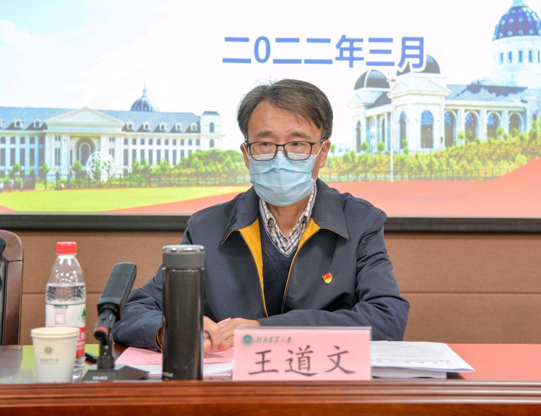 学术副校长、院长王道文讲话。就做好学院疫情防控工作,他提出以下三点要求:一是要进一步提高政治站位,切实增强做好疫情防控工作的责任感和使命感;二是要完善健全网格化管理体系,织密筑牢疫情防控工作网络;三是要落实落细学校各项防控工作举措,认真夯实疫情防控工作的各项责任。