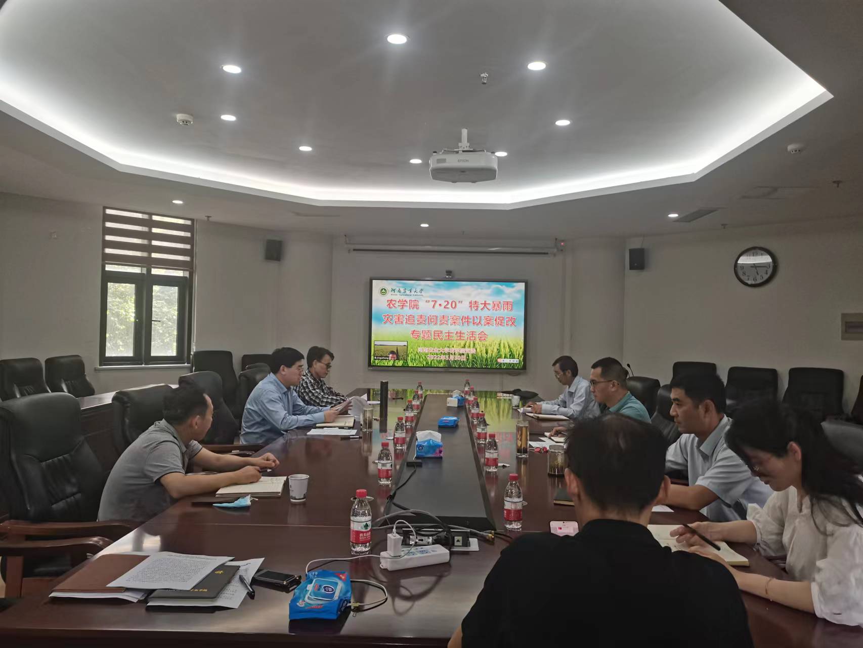 在第一实验楼南201会议室召开“7·20”特大暴雨灾害追责问责案件以案促改专题民主生活会。校纪委第一纪检监察室主任李宗品到会指导。全体院党委委员参加会议。会议由校党委委员、院党委书记郭战伟主持。