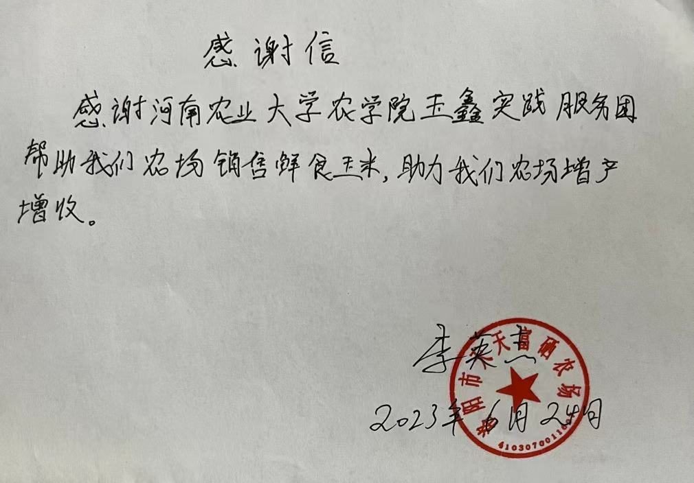 鲜食玉米种植户为“玉鑫”实践团师生手写感谢信