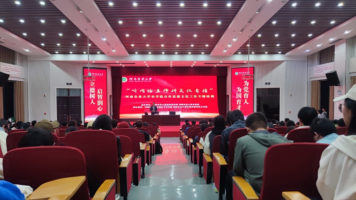 讲座伊始,周红飞分享了自己的个人经历,语言幽默诙谐,以时事热点为例,引出主题文化自信,从农学人文精神切题,拉进与农院学子的距离。随后,周红飞向与会师生详细讲述了国家变革及我校历史文化,从中总结出文化自信是一个人,一个学校乃至一个国家立足的根本,表示面临如今世界百年未有之大变局,要坚定不移走自己的路,始终怀有“河南农业不求改良,无以植工商之基础,即难与世界列国相竞争”的志向,明确作为一名农科人的使命,树立专业自信,厚植爱国情怀。谈到如何提升文化自信,他提出“比较优势”这一观点,即在与他人的比较中提升自信,鼓励草榴