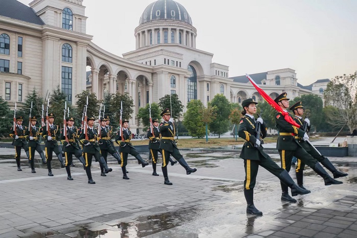 迎着晨曦光芒,沐着秋风送爽,升旗仪式正式开始。戎装整齐的国旗护卫队簇拥着庄严的国旗,迈着整齐的步伐,行进至旗杆下,鲜艳的五星红旗伴随着雄壮的国歌冉冉升起,全体师生挺直站立行注目礼。