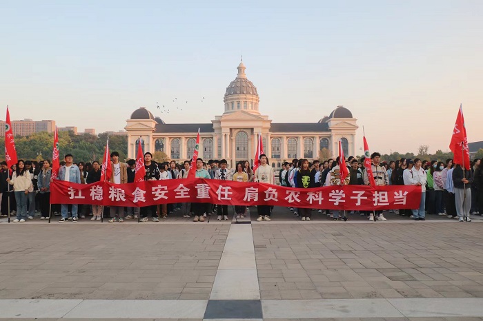 院艺术团在国旗下进行以“珍惜粮食,筑牢生命之基”为主题的诗歌朗诵,激情澎湃的声音蕴含着对农学的热爱,对国家的承诺,对农业前景的信心。